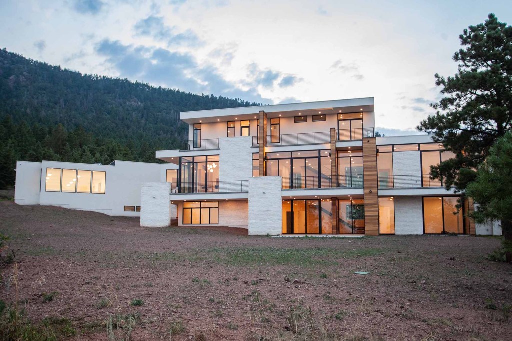 The design was for a 10,538-square-foot, seven-bedroom custom home in Monument, Colo. The modern style home hints at a South Beach art deco vibe, given the expansive glazing, crisp bold lines, and white unadorned stucco finish.