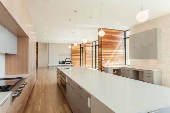 The exterior aesthetic also featured a striking design element that provided a warm, even playful contrast to the sea of white. That signature effect was a continuous, seamless band of wood cladding running non-stop from the exterior through the interior.