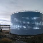 One worker with a flame-cutter made each of the 150-millimeter- (5.9-inch-) diameter holes—a challenge given that the silo’s shell is 22 millimeters (nearly 1 inch) thick at its base. The holes allow for smoke extraction, air circulation, and daylight penetration. They also fulfill an aesthetic need. Throughout the day, the silo appears to shimmer, thanks to 400 polished stainless steel discs measuring 50 millimeters (nearly 2 inches) in diameter. Spaced at random intervals around the drum, the mirrors sit flush against some openings and flicker in the wind. At night, 1,280 warm-white LED dome luminaires in the evenly spaced holes set the silo aglow. Steel brackets attach the mirrors and LEDs to tensioned steel wires that run vertically inside the silo wall.