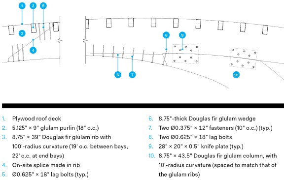 To fabricate the timber structure, Centerbrook worked with Goodlam (a division of Goodfellow), based in Delson, Quebec, just outside MontrĂ©al, which specializes in custom glulam projects. To achieve the columnsâ 10-foot-radius curvature, Goodlam used half-inch laminations, finger-jointed by hand and shaped by a custom steel jig to ensure consistency. For the ribsâ 100-foot radius, Goodlam used 1.375-inch laminations. It took Goodlam 30 days to fabricate the glulam members, which totaled 22.5 miles in length.