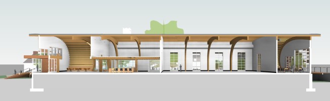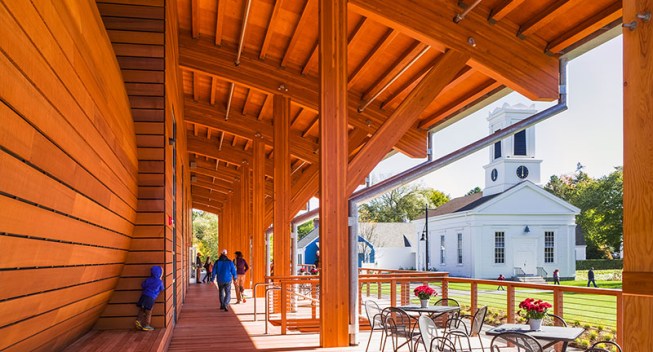 Subsequently, the building draws on everything from early shipbuilding to the radial geometry of mollusk shells. It assumes the form of a three-story wave cresting around the entrance to the building, which becomes part of a new arrival sequence. Its northern roofline curls toward the ground while the southern roofline extends over a wraparound porch, supported by thick timber posts that recall the mast of early sailing ships. The prevalent use of exposed timber structure is reminiscent of wooden hulls.