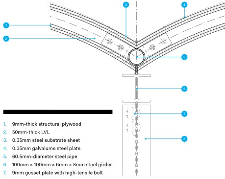 This story has been updated since it was originally published. The timber ribs did not need to be recut, but rather the gusset plates had to be bent to achieve the proper angle. ARCHITECT regrets the error.