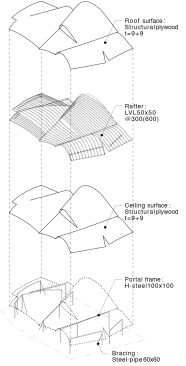 The final roof structure consists of two layers of structural plywood that sandwich a series of curved LVL ribs. The ribs were cut to the specified radii by CNC machines out of 2-inch-thick LVL panels. They attach to the portal frames via a 2-inch-round steel pipe with welded steel plates. For longer spans, the ribs are spaced at roughly 1 foot; for shorter spans, 2 feet was sufficient. Shelter’s Yoshihiro Kimura, who managed the Toranoko project, says the roof structure was so thin that he worried it would fail. So his team built a full-scale mock-up to test the roof’s stability.