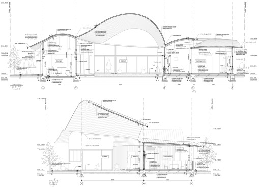 The roof structure is a combination of structural plywood and laminated veneer lumber (LVL), which allows for a thin profile even at long spans. Takashige became interested in LVL technology while at SANAA and had begun talking with experts at the Japan-based timber manufacturing company Shelter about its applications.