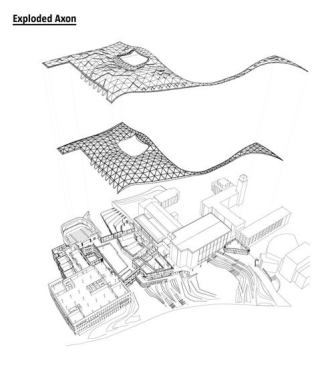 propped the gridshell up with tubular steel pylon columns that anchored