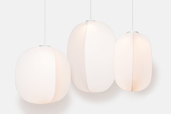 A web of thin threads supported by a crossed-wire hoop frame and sealed with a matte lacquer creates Mori’s shear, yet durable, fabric-like shade. Introduced at ICFF in New York in May, the LED pendant offers 2700K with a CRI of 80, emulating a cocoon with its muted, warm glow.