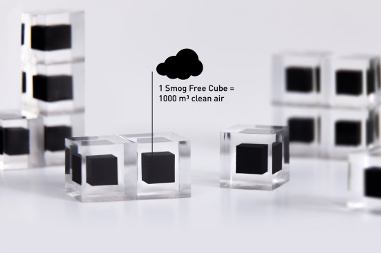 According to Roosegaarde, the tower cleans 30,000 cubic meters of air per hour using 1,400 watts of power, resulting in a clean “bubble” the size of a playground or small park. The initial version, located in the Dutch city of Rotterdam, was made possible through a successful Kickstarter campaign, though the studio hopes to build other filtering towers elsewhere. In exchange for their funding, backers received products like rings and cuff-links containing black, 8.4-millimeter-cubes of particulates filtered from 1,000 cubic meters of air—a clever design provocation that transforms waste into a personal treasure.
