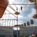 Several projects demonstrate the potential of urban freestyling. MountMitte, a parkour mecca in Berlin, is an urban playground on steroids: a multidimensional, multifaceted obstacle course complete with zip lines, barrel runs, and suspended cars. This 1,000-square-meter (10,764-square-foot) adventure park by German design firm Inhaber + Bau KristallTurm will pique the interest of even the most sedentary teenager or adult.