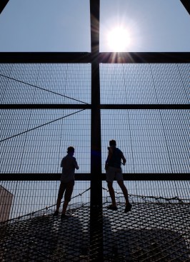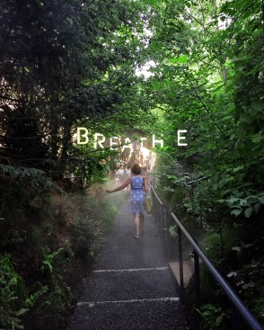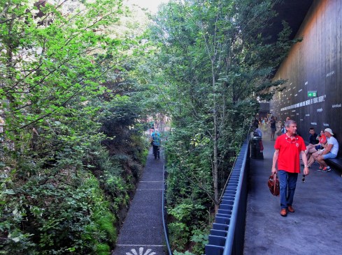 Experienced, as I did, during a searing 100 F day, the pavilion is effective. One feels refreshed and cleansed despite the roofless environment and lack of air conditioning. Illuminated letters hover below the tree canopy, partially shrouded within the cooling vapor of inconspicuous misting devices, and spell thematic words and phrases like “breathe” and “nature reloaded.” Breathe.Austria’s brilliance is its simplicity: The replenishing micro-timberland is the star of the show and the structured enclosure assumes a deferential role.