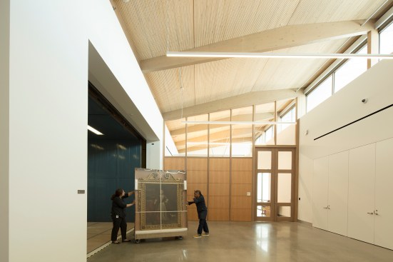 It may seem counterintuitive, but art conservators actually need large amounts of high-quality daylight to help them accurately render colors and detect issues with centuries-old works. The center’s bent-shed-style roofs bounce light down through clerestory windows into the center’s double-height studios. A subtle whitewash on the exposed underside of the dowel-laminated timber (DLT) roof deck increases the ceiling’s reflectivity and also prevents the wood from reddening the light’s hue.