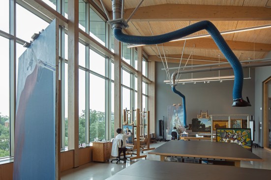 Each studio is oriented in response to its program: the paintings studio, which requires large amounts of indirect light, faces north with a full wall of windows, while the sculpture studio faces south “because they need more direct, bounced light to see the nuance to the shaping of the sculpture,” explains firm co-founder and partner David Lake, FAIA, who’s based in Austin, Texas. “It was an interesting [challenge] to help each studio do what they do best.”