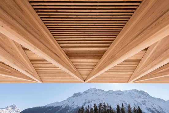 Designed by Norman Foster, the angular wood members recall the surrounding Swiss mountains of St. Moritz.