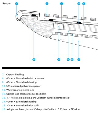 Instead, engineers in Blumer-Lehmann’s free forms department use specialized CAD/CAM software to convert Foster + Partners’ 3D models into a format ready for manufacturing. The components were then “precisely machined on all sides on a CNC machine to achieve a perfect fit for the assembly,” Riggenbach says. Foster + Partners says such complexity was well worth the trouble, as it allowed the wood grain and lamination to follow the curve of the beam as well as eliminated the risk of an end-grain cut being exposed to rain and snow.