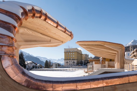 Today, the club has been joined by a pair of timber pavilions, located just north of the Eispavillon. At just 580 square feet, the south-facing “sun pavilion” resembles a scale model of the 2,000-square-foot main pavilion. Though conspicuously modern, the pavilions’ prominent use of wood and copper flashing recall the materiality of the original club. “There is a great tradition of wooden buildings in St. Moritz,” Foster says. The pavilions’ primary structure is made from ash harvested in Switzerland, while the curved edge beam and wood slats are made from larch, “a traditional local wood, which mellows beautifully with age,” he adds.