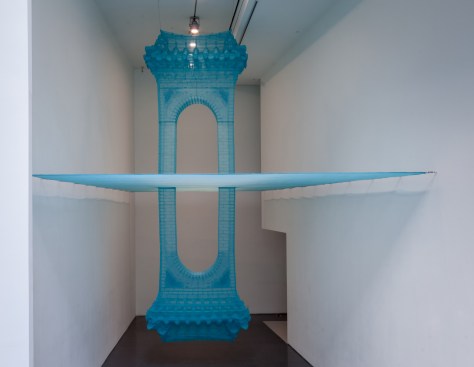 If the Gwangju rooms emanate a palpable gravitas, the five other life-sized installations at the CAC seem impossibly ethereal. A collection of Suh’s constructions made of translucent fabric includes a set of household appliances (shown above), a mechanical room, a traditional Korean gate, a hallway, and a multistory stairwell. Meanwhile, the artist’s “Specimen Series” includes typical home appliances, such as a stove, radiator, toilet, and sink, all crafted in meticulous detail using diaphanous polyester. The devices’ ghostly appearances are enhanced by their placement above illuminated platforms. In the small “Boiler Room,” Suh recreates piping, conduit, mechanical apparatus, and a concrete masonry unit enclosure at a surprisingly intricate level. “Reflection” consists of a reconstructed masonry gateway and its vertically mirrored image, which are both suspended above the gallery floor. The exquisitely detailed structure in blue textile pays homage to Suh’s family home in Korea, itself a reconstruction of a historically significant Yi Dynasty building.