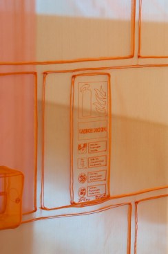 The remaining two “Passage” fabric installations can be occupied. The “Wielandstr. 18, 12159 Berlin, Germany – 3 Corridors” embodies the exhibition’s title, articulating an extended hallway in colorful textiles with doorways and side passages—including a fire extinguisher, light switches, and exit signage. The three-story “348 West 22nd Street, New York, NY 10011, USA – Apartment A, Corridors and Staircases” is the most impressive structure in the exhibition, given its lofty height and structural detail. This full-scale commemoration of the climb to Suh’s former apartment, in Chelsea, New York, includes a bi-color textile rendition of a wooden stair and balustrade, walls and openings, and even sprinklers and light fixtures. The building’s structure is absent, allowing viewers to appreciate the floor plates, stair undercarriage, and plenum as voids. As with Suh’s other fabric installations, a metal-wire skeleton provides structural support and is cleverly painted to match the textile panels attached to it. In this way, the structure nearly vanishes while foregrounding its ephemeral skin.
