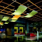 Product: METALWORKS™ Radial Custom Ceiling, SOUNDSCAPES® Shapes Acoustical Clouds, and Custom SOUNDSOAK® Walls