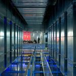 Walking into the heart of NY4 is like entering the future—or the guts of a megascale computer. The space is vast: 343,000 square feet, the size of nearly six football fields. Its core is packed with machines, and offices line its perimeter. We make our way down a long, straight corridor, illuminated by blue LEDs—Equinix’s trademark, Poleshuk says—and flanked by glass doors that allow us to see into the server cages.