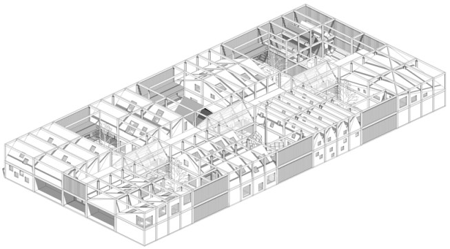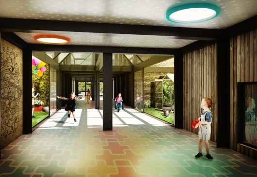 “Kids City” is envisioned on a grid system, but with the sloped roofs and cottage-like features kids typically associate with buildings and homes. The city features wings made to accommodate about 25 students and a separate entry for adults. In addition to open classroom spaces, the design really is a small city. Other features include outdoor spaces along the grid resembling small city parks, gardens and greenhouses where students learn ecology, theaters for performances, and multi-purpose rooms with storage. The modular grid system allows for standardization and ease of expansion.