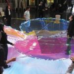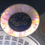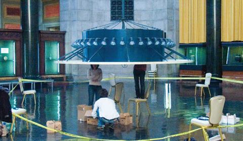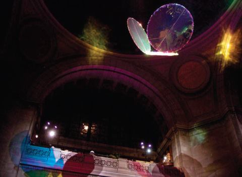 After much analysis of the site conditions and consideration of the theme for the evening—architecture looks forward and back—the students and instructors opted to design a kite that would attach to the existing light fixture in the rotunda’s dome. Made of a 21st-century material, 3M radiant light film CM500, whose properties both reflect and refract light, the kite was affixed to 20th-century lightweight carbon rods manufactured by the kite industry. In turn, the kite was attached by fishing line to the existing center light fixture, cross-lit with a small number of metal halide Altman Spectra PAR lamps and top-lit with the existing center luminaire’s PAR38 lamps. The fishing line also served as the mechanism by which the kite was lowered and raised for installation.