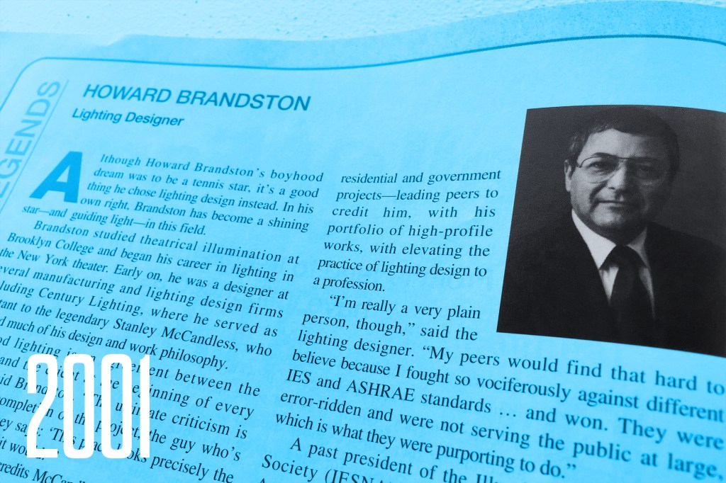 In all, Brandston has more than 30 years’ experience in lighting design, engineering and electronics—designing illumination for more than 2,500 commercial, institutional, residential and government projects—leading peers to credit him, with his portfolio of high-profile works, with elevating the practice of lighting design to a profession.