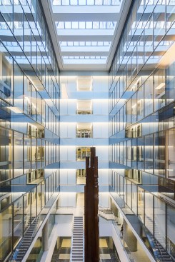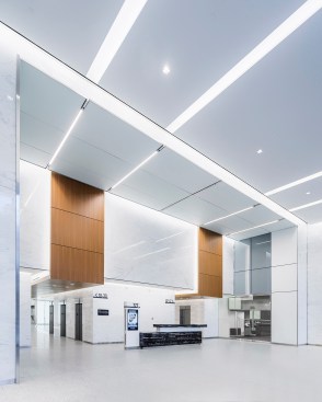 To breathe new life into the public spaces of this mixed-use complex originally constructed in the mid-1970s, the architecture and lighting teams developed a new architectural language using different glass elements. Lighting was coordinated to complement the different levels of reflectivity of the material palette (wood and glass) and employed a variety of techniques from backlit panels to frosted mirrors to covelighting. The renovation established a clear navigational sequence with a main entrance, retail spine, and a new elevator core in the central atrium space. The renovation results in a series of spaces that are open and airy and feel luminous throughout the day.