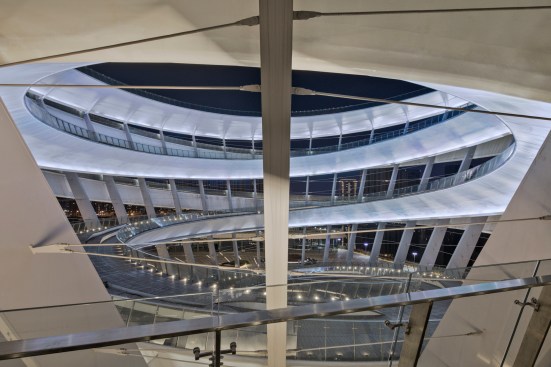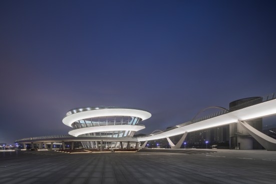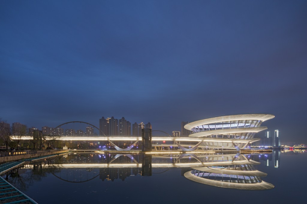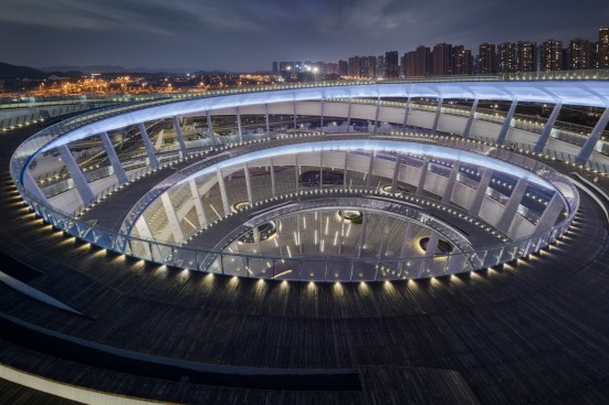 Located in the southwest section of the Chinese city of Changsha, this new urban axis creates a multi-functional public space for visitors to enjoy the panoramic views of Lake Meixi and the city’s planned expansion. The 111.5-foot-tall structure rises above a manmade plateau on the lake and features an exposed ramp that varies in width from 20 feet to 26 feet as it spirals from the base to the top of the structure. An interior ramp provides access back down to the new public plaza.