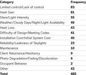 When asked about the major problems associated with daylighting designs, 91 percent of architects provided at least one with an average of 1.7 problems per architect. The most frequently cited problems relate to lighting control and heat gains (Table 2).