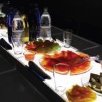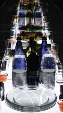 Every detail of the table was thoroughly thought out from the types of springs, which activate each place setting when silverware, a plate, and a glass are placed on top of it causing it to depress and illuminate, to the use of the photometric chart of the T5 lamps inside the table sections as the abstracted graphic etched into the sheets of clear plexi, which serve as the table’s surface. Even the selection of food and wine and water bottles were chosen for the way they would appear when illuminated.