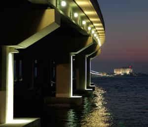 At each of the shoreline abutments of the 1.6-mile-long structure, 70W metal halide accent lights are used to highlight the underside of the bridge. Douglas points out that these accent lights were the result of forward-thinking to provide adequate illumination levels for people passing under the bridge through a shoreline park area.
