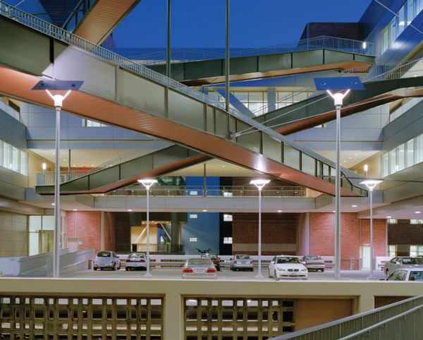 Illuminated by 150W ceramic discharge metal halide lamps, the central courtyard over the parking facility is intersected by suspended bridges and stairs that connect the building’s laboratory and classroom spaces. Brad Feinknopf