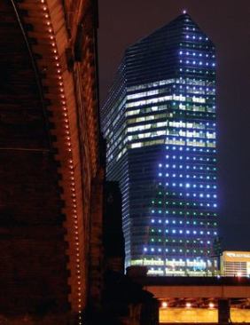 SOLUTION Hennes notes that in 2002, when CBBLD started the project, light-emitting diode (LED) technology was still developing in regard to architectural uses. However, the technology has advanced in the past six years, and the designers were conscious of that as they worked on the lighting design and created mock-ups and renderings featuring LEDs. In the end, they were able to make an informed decision about the technology and chose to use LEDs for the building’s exterior lighting as well as the illumination of the lobby and elevator cabs.