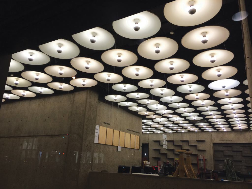 What I really wanted to see was that lobby ceiling, which Breuer designed with the assistance of Edison Price. It’s a signature feature of the space—a field of fixtures with shallow disc reflectors housing half-silvered lamps. It creates a rich visual that many have tried to emulate. An architectural lighting design moment such as this is important for a number of reasons, not the least of which is that it represents a particular design thinking and execution with the lighting technology of the time. Today, such a solution might not even be considered because of available source options and energy code requirements.