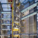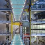 In this atrium, you know Rogers is your host: Its glass roof juts out severely like a blade’s edge over the deep forecourt of the complex, supported by a finely machined and cabled structural “tree.” Rising from the ground at the atrium’s heart, it is painted yellow, with two enormous trusses reaching as limbs to undergird the roof’s far edges. The tree’s smaller, lower branches embrace a glass elevator shaft and support a layered network of open stair platforms and illuminated glass bridges that cross to the two adjacent buildings.