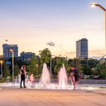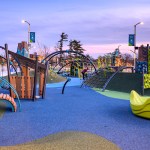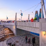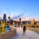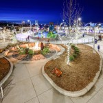 FGP area lights and Torres area, wall-mounted, and catenary lights were chosen for their contemporary aesthetic, which Clark describes as “timeless and interesting.” The FGP area lights are located along the perimeter of the park, pathways, and ice trail. The family of Torres fixtures gave Clark the ability to aesthetically connect elements from taller area lights around the ice pond to smaller, wall-mounted fixtures on the community center and other buildings. “Lights are an important element of any site, even in the daytime,” Clark says. “They link things together. They create a visual experience at night, but they also unify shapes and define pathways.” Architecture and engineering firm Stantec created the park’s electrical and lighting plan.