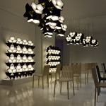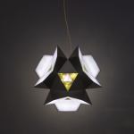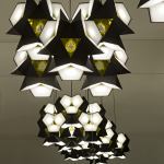 First introduced as a prototype at Euroluce in 2009, the octahedron-shaped module is fabricated from injection-molded polycarbonate components with a matte black finish and a semitransparent yellow core of reflective surfaces backlit by LEDs. Measuring approximately 21 inches wide by 22 inches long by 18 inches deep, each module’s light from its outward-facing LED boards is evenly distributed via the polycarbonate refractors. The LEDs are arranged to emit white light and to create a luminous yellow kaleidoscopic effect in the center of the module. Because the LED technology is dimmable, Starbrick provides both directional and ambient light while expressing different qualities and hues of light produced by the LEDs. When multiple Starbricks are stacked, the number of opaque surfaces is limited so that the prominent feature between the bricks is the actual light.