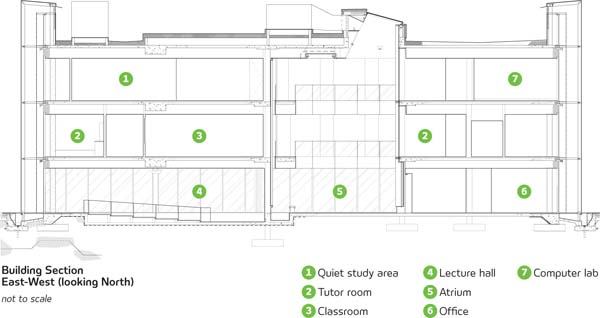 Inside, the careful use of fluorescent lighting and LEDs balance the two facets of the center: its active public atrium on the ground floor and its quieter study spaces and teaching areas on the upper two floors. “At the beginning of the project our aim was to minimize distractions and reduce the presence of lighting in the study spaces, but … the other piece of the puzzle was to pay tribute to student athletes,” recalls Mark Godfrey, senior lighting designer in Interface Engineering’s lighting studio.