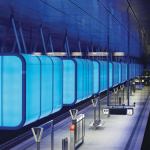 Project: HafenCity University Subway Station, Hamburg, Germany • Client: Hamburger Hochbahn AG, Hamburg, Germany • Architect: Raupach Architekten, Munich • Lighting Designer (competition schematics through Phase 3): Pfarré Lighting Design, Munich • Lighting Designer (phase 3 to project completion): D-Lightvision, Munich • Light Box Designer and Fabricator: Design Stauss Grillmeier, Munich • Project Size: 51,667 square feet • Project Cost: Not Available • Lighting Cost: Not Available • Watts per Square Foot: Not Available • Energy Code Compliance: In Germany, there is no energy code regulation that restricts energy usage for public spaces. • Manufacturers/Applications: Alexander Weckmer GmbH (custom color-changing LEDs for light boxes); Erco (35W metal halide downlights in the ticket areas); manufacturer unknown for fluorescent covelights throughout station.