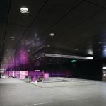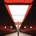 The light boxes are each equipped with two distinct lighting systems. The bottoms of the containers are outfitted with fluorescent fixtures that provide the necessary soft white illumination to the platform. The side and end panels of each box, on the other hand, are brought to life by 280 RGB color-changing LED fixtures. Each container requires 1,100W of power, a large amount and one that would not be possible in the U.S., where energy codes for public projects restrict such power usage. In Germany, there is no such code. Access doors at the end panels of the containers allow entrée for maintenance. The station’s ticketing and entrance areas are lit with recessed, compact fluorescents and a smattering of 35W metal halide downlights.