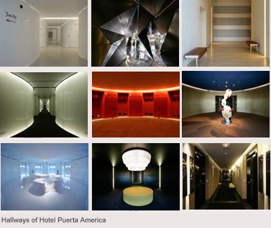 » Touted as one of the ‘it’ projects of 2005, owing to its exorbitant cost and cadre of notable designers, the Hotel Puerta America on the outskirts of Madrid simultaneously enthralls and confuses. Commissioned by Spanish company Silken Hotels, 19 prominent architects and designers, some working individually and others in pairs, were provided with an outlet to explore their creativity without budgetary constraints. (The final cost of the 342-room hotel was over $90 million.) The result is a series of elaborately designed spaces; so different in their styles that one design magazine referred to the hotel as an ‘interior-design theme park.’