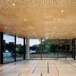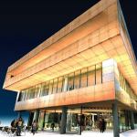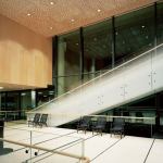 The lighting design starts at the building’s exterior. Taking almost a full year to define how they would create the luminous quality and effects as modeled in the architect’s original rendering of the building at night, the lighting design team embarked on a lengthy full-scale mockup process. The task was to create a building that would glow from the inside, reminiscent of traditional Swedish wood veneer lamps, yet still be clearly visible from a distance. The solution was a T5, 2700K fluorescent fixture, designed with Swedish lighting manufacturer Smedmarks, positioned in the 2nd floor balcony handrails to provide indirect light. Allowing the handrail to function as a reflector, light washes the glass panels and the underside of the balcony above. To illuminate the building’s corners, the designers used inground-recessed fixtures with metal halide lamps. Rounding out the exterior luminaires are downlights along the main entrance ramp and recessed LED fixtures in the entry steps.