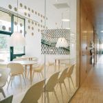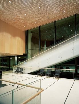 Continuing the idea of glowing light into the building’s interior, the ceiling plane is transformed into a shimmering luminous surface, what the designer’s refer to as the “cloud.” The perforated wooden ceiling, patterned with dimensionally thin holes, densely clustered in the center and randomly extending to the ceiling edges, is backlit with linear fluorescent tubes. A white acoustic fabric backs the wood and acts as a light diffuser. The dappled lighting effect creates a sense of movement across the ceiling and leads the visitor’s eye through the space. As lighting designer and project manager Eva Persson explains, ‘The presence of light is strongly felt without seeing a light fixture.” The “dot” motif, which recalls the early morning mist common to the Swedish natural landscape, is repeated elsewhere in the building, most noticeably as a frit pattern on the interior vertical glass planes of the stairway that leads to the below-grade conference center, and the interior glass walls that separate the embassy entrance from the public reception area.