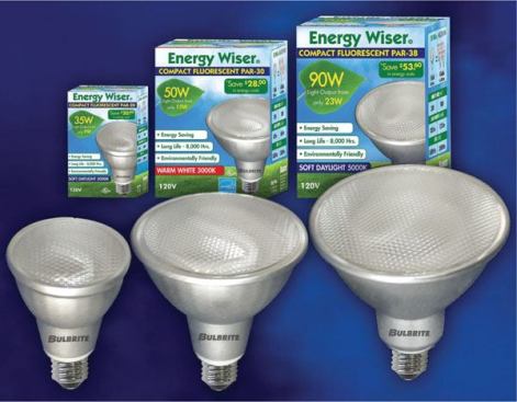 The Energy Wiser brand of PAR20, PAR30, and PAR38 compact fluorescent direct replacement lamps for halogen PARs each promise a 75 percent energy savings and to last up to six times longer than traditional incandescent sources. The 9W PAR20 CFL replaces a 35W halogen PAR20 and produces 350 lumens at 3000K or 310 lumens at 5000K. The 15W PAR30 CFL is Energy Star–approved and is equivalent to a 50W halogen PAR30, offering 670 lumens at 3000K or 630 lumens at 5000K. The Energy Star–approved, 23W PAR38 is comparable to a 23W incandescent PAR38, offering 1,200 lumens at 3000K or 1,050 lumens at 5000K. All three lamps last up to 8,000 hours and have a CRI of 82. bulbrite.com
