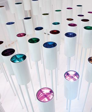 Lighting Services Inc looked at the digital age’s trend of instant gratification and transformed that into a vision of a fixture that could deliver the same degree of control in the form of mood-inducing light. The company’s installation featured an artistic rendition of this possible future luminaire, which it dubbed “iMood-Light.” In it, a series of 9W, 2700K LED fixtures equipped with spot modules were mounted to rigid stems of various lengths, producing an 8-foot-by-8-foot wave formation. The LEDs projected onto a blank canvas floating above the installation. Visitors could change the color and intensity of the light through a theatrical control system installed on an iPad2, selecting such moods and emotions as romantic, calm, and moonlit. “With a simple touch to your smartphone or tablet, you can transform your lighting environment to be what you want it to be,” Kane says. “Will it be an efficient office, a funky lounge, or a bewitching night? Only you can decide.”