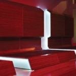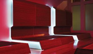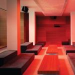 Throughout the lounge, approximately 5,000 LEDs are employed, which according to Lumen’s website use only as much power as it takes to run a microwave. Although the system offers more than 16 million color combinations and multiple color ranges, warmer tones generally are used to best compliment the space. LED technology was selected for its longer lifespan and because, as Gogarty explains, it “gives us the ability to change patterns, textures, atmospheres, and moods through three different inputs.” A video system functions as a light source by incorporating direct video, audio, and motion. Infrared cameras sense the proximity and movement of club-goers and in turn transfer the information via DMX to the lighting system, which responds with a ripple-like effect while the audio system simultaneously syncs itself with the beats of the music.