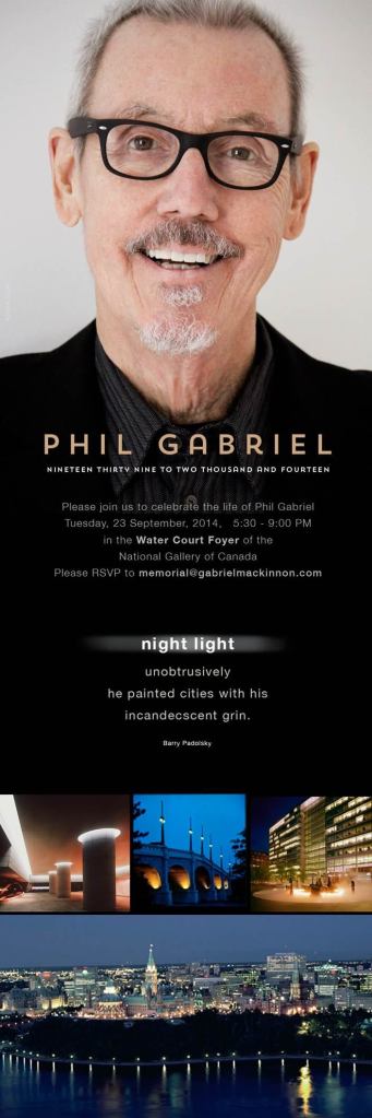 A memorial service honoring Phil Gabriel, who passed away in August, will be held Sept. 23 from 5:30 p.m. to 9:00 p.m. in the Water Court Foyer of the National Gallery of Canada, Ottowa, Ontario, Canada. Please RSVP by Sept. 16 to memorial@gabrielmackinnon.com.