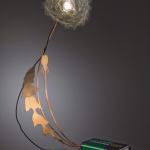 Studio Drift now numbers seven full-time employees, augmented by a body of 30-odd freelancers, but the strength of the company’s output lies solidly in the combination of its founding partners’ interests. “Lonneke has always been into nature on a micro scale: looking at how plants function, looking in between the grass in the garden to see what’s happening, what kind of life is evolving,” Nauta says. “As a boy, I was always interested in science fiction, not so much in the sense of laser fights, but in the technology behind it. It’s a predecessor of technological revolutions. These [differing interests] work well together. We decided to keep both the stuff we are fascinated the most about and go from there, and see where it leads. As a result, our work has always been about nature and technology morphing together.” A perfect example of this melding of the natural world with cutting-edge technology is the piece that first garnered Studio Drift recognition: Fragile Future. Winner of the “Light of the Future” prize from the German Design Council in 2008, the Moët Hennessy–Pavilion of Art and Design London Prize 2010, and now in the permanent collection of the Victoria & Albert Museum in London, Fragile Future is composed of a three-dimensional orthogonal framework of delicate phosphor bronze tubes supporting a constellation of LEDs that are covered in dandelion seeds. Studio Drift harvests dandelions by hand and painstakingly glues their seeds to the LEDs. “We use real dandelion seeds because they have a beautiful quality of diffusing the hard bright LED light,” Nauta says. This precise handiwork is combined with industrial processes, such as laser cutting and bending the metal. Each 8-inch-by-8-inch-by-4-inch module consists of three LEDs, and each installation contains between three and 100 modules.