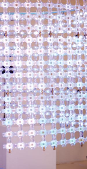 Giving us a peek at karaoke bars of the near future, Osram Sylvania and Traxon e:cue’s “Illumination Idol” wrapped aspiring singers in a 3-foot-by-12-foot curving web of colored points of light that responded to each note, bass line, and voice crack. The two companies teamed up to pair Sylvania’s MusicLites technology—which combines 10W LED lights, a 70-millimeter, full-range, high-fidelity loudspeaker, and a wireless audio receiver in a single module—with Traxon’s Mesh RBG, a LED module that produced a blinking Lite Brite–like reaction to the songs. Singers, with a cascade of light behind them echoing the crescendos in the pop songs, were displayed for the audience on Sylvania’s Kreios LED Image Projector. The system may have been entertainment for party guests during the course of the evening, but it also signals a trend toward systems integration in building envelopes. “There’s a new emphasis on a systems approach to lighting,” says Shaun Fillion, lighting project design manager for Osram Sylvania. “We’re viewing light as an architectural element instead of discrete systems, and the benefit to the user is seamless integration.” To these users, the benefit was also a good, harmonious, time.