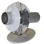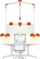 Description: Two cylindrical diffusers rotate around one another to create different light levels. The outer diffusing cylinder is translucent, while the inner is opaque; both sit inside a metal reflecting cylinder. The user controls the light levels and beam spread by adjusting the knobs on either side of the fixture. The fixture head telescopes in and out of its base to accommodate different monitors. The luminaire takes a T2 fluorescent, and the ballast is concealed in the weighted base.