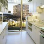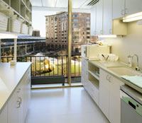 From Visnick’s experience, dental practitioners usually have a hand in how the space is to be designed. ‘Dr. Charles Trauring happens to have great vision, a sense of functionality, and a good eye for design,’ says Visnick. For example, the long, narrow corridor leading to the operatories was at the minimum width of 44 inches required by code. Lighting was used to help it feel more spacious than it actually is. ‘We created cloud-shaped soffits constructed from gold-painted wood, and set them at varied heights on opposite sides of the corridor to mark the entrances to the operatories,’ Visnick explains. Each ‘cloud’ includes an uplight and a downlight component: an 18-inch-long fluorescent tube brightens the ceiling and emphasizes its height, and a compact fluorescent marks each operatory entrance. The operatories enjoy ample illumination from a system of two 8-foot-long indirect fluorescent pendants suspended by aircraft cable. Task light fixtures illuminate the patient’s mouth area. ‘We wanted the lighting of the room to be at a similar level, so that when the practitioner needs to look away and reach for a piece of equipment, the irises aren’t strained by continually opening and closing to accommodate significant light level changes,’ Visnick explains. Moreover, the indirect lighting system allows patients to recline and gaze up comfortably during examinations and procedures and prevents any severe glare problems resulting from the evening darkness. The design team also selected surfacing materials to avoid glare, such as matte finishes on the neutral-toned countertops and cabinetry.